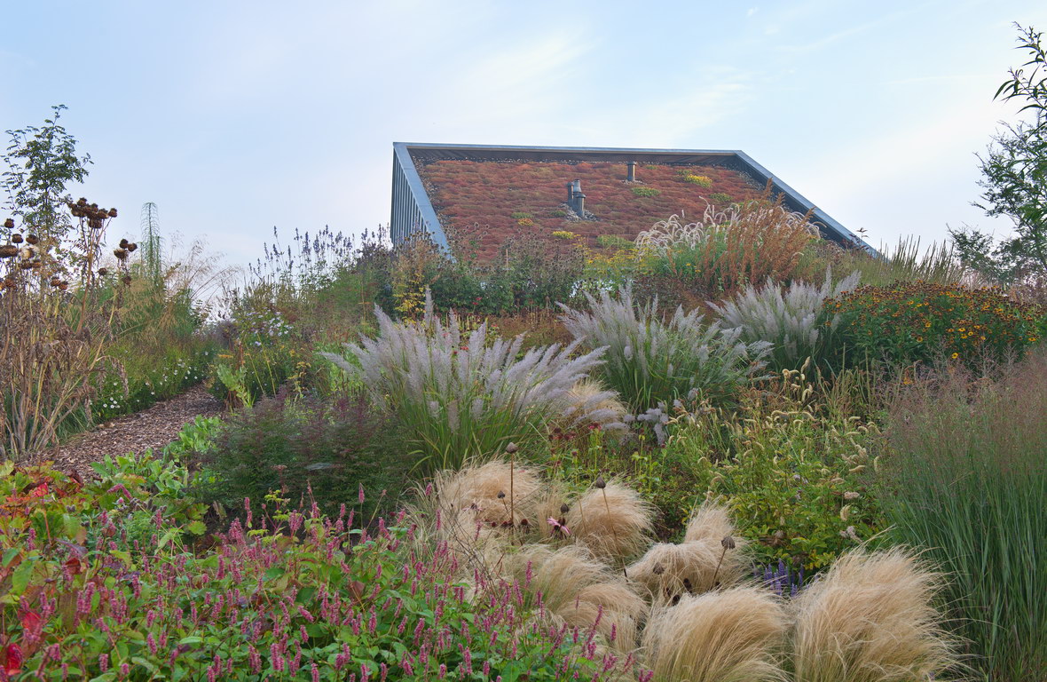 - Calamagrostis brachytricha, Dachbegrünung, Pennisetum orientale, Präriegarten, Sedum, Stipa