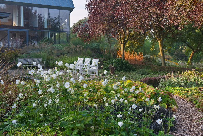 - Blutpflaume 'Nigra', Phlomis russeliana, Polygonum amplexicaule, Präriegarten, Prunus cerasifera 'Nigra', Teich, Wasserbecken