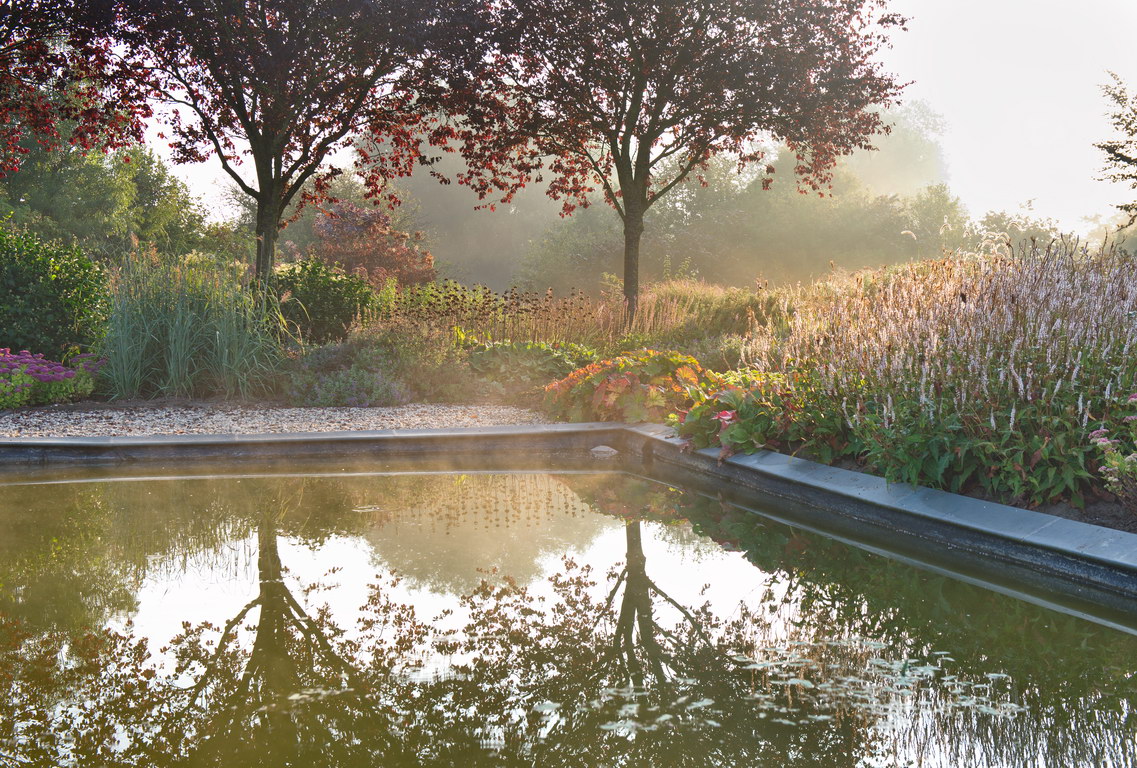 - Blutpflaume 'Nigra', Phlomis russeliana, Polygonum amplexicaule, Prunus cerasifera 'Nigra', Teich, Wasserbecken, Präriegarten