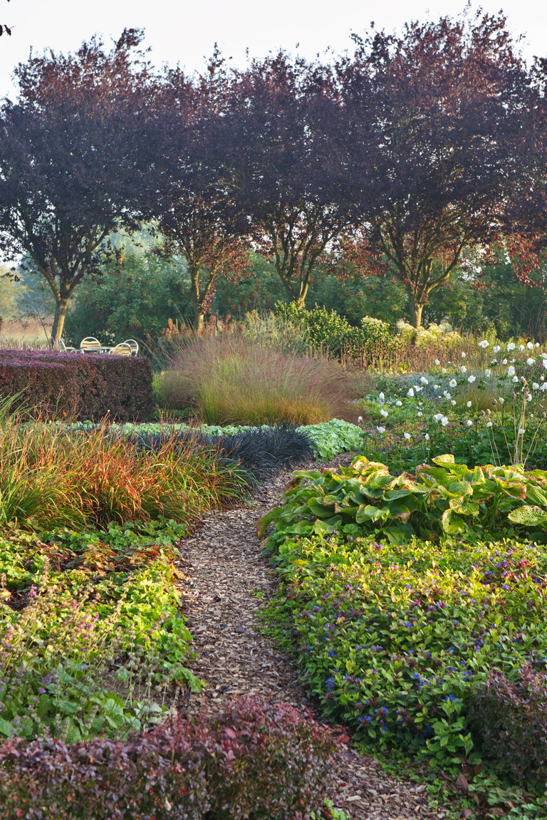 - Anemone hupehensis 'Alba', Blutpflaume 'Nigra', Bodendecker, Ceratostigma plumbaginoides, Chinesische Bleiwurz, Herbst-Anemone, Kriechende Hornnarbe, Ophiopogon planiscapus 'Niger', Präriegarten, Prunus cerasifera 'Nigra'