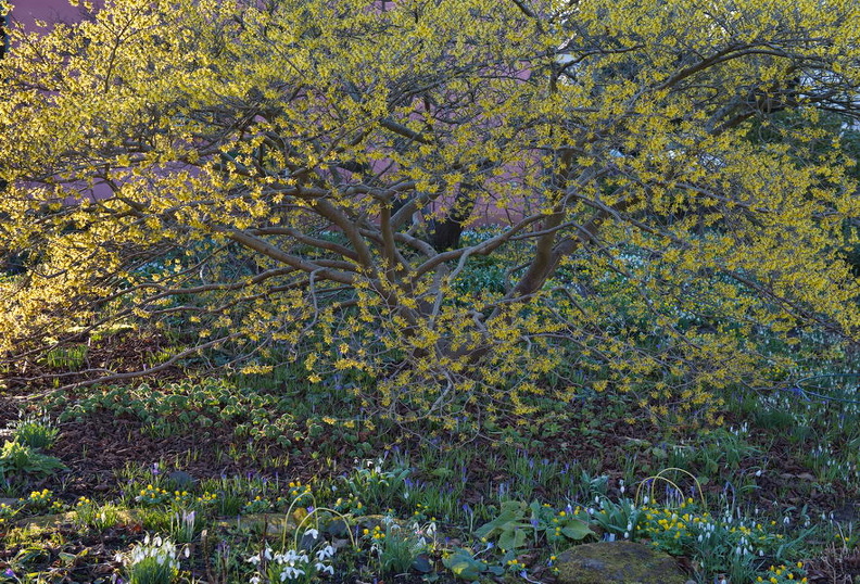 - Eranthis hyemalis, Hamamelis, Garten Maier