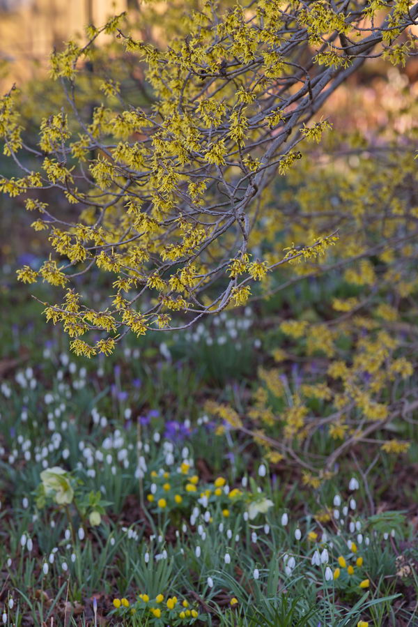 - Eranthis hyemalis, Hamamelis, Garten Maier