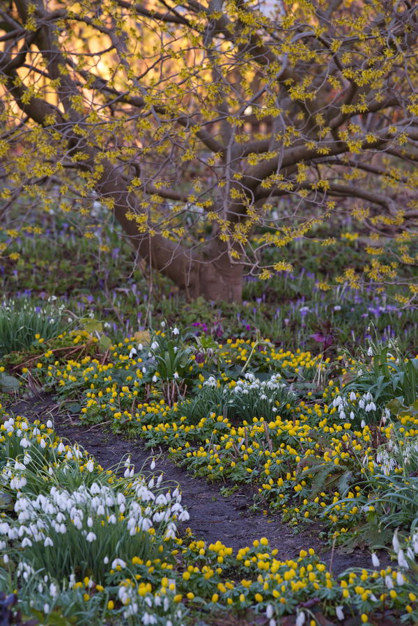 - Eranthis hyemalis, Hamamelis, Garten Maier