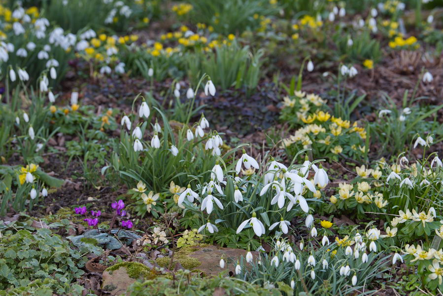Eranthis hyemalis 'Schwefelglanz', Galanthus 'Bill Bishop', Garten Maier