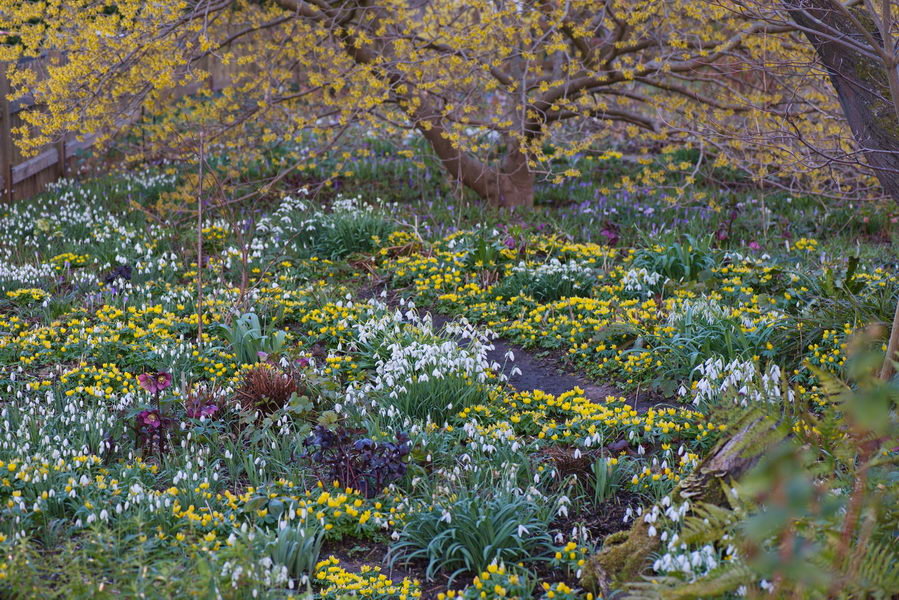 - Eranthis hyemalis, Hamamelis, Garten Maier