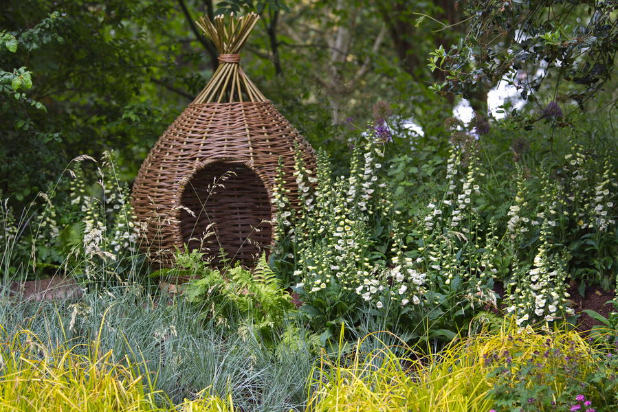 - Chelsea Flower Show 2018, Design Judith Needham, Digitalis, Digitalis purpurea 'Alba', Gräser, Pavillon, Weidengeflecht