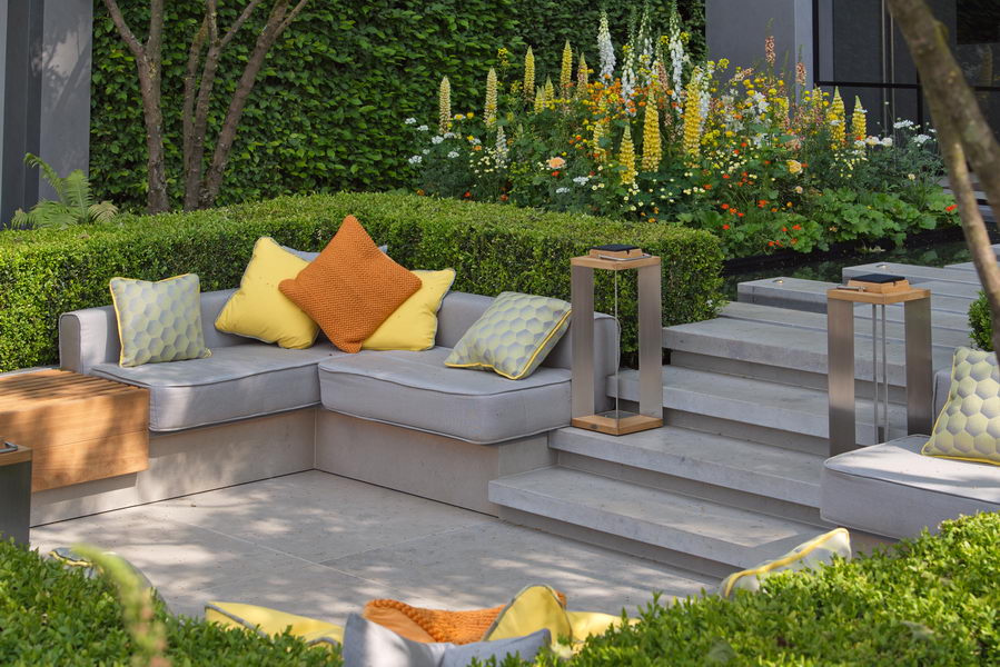 - Aquilegia vulgaris ‘Alba’, Astrantia major ‘Large White’, Camassia leichtlinii ‘Alba’, Delphinium ‘Sungleam’, Digitalis, Geum ‘Banana Daiquiri’, Geum ‘Totally Tangerine’, Hesperis matronalis ‘White’, Lilium perenne ‘Album’, Lupinus ‘Desert Sun’, Lupinus ‘Gallery White’, Melica altissima ‘Alba’, Orlaya grandiflora, Phlox divaricata ‘Fuller’s White’, Ranunculus acris ‘Citrinus’, Senkgarten, Sitzplatz, Tellima grandiflora, Trollius europaeus, Trollius ‘Cheddar’, Trollius ‘Lemon Queen’, Verbascum ‘Gainsborough’, modern, Terrasse, LG Eco-City Garden, Design Hay Joung Hwang