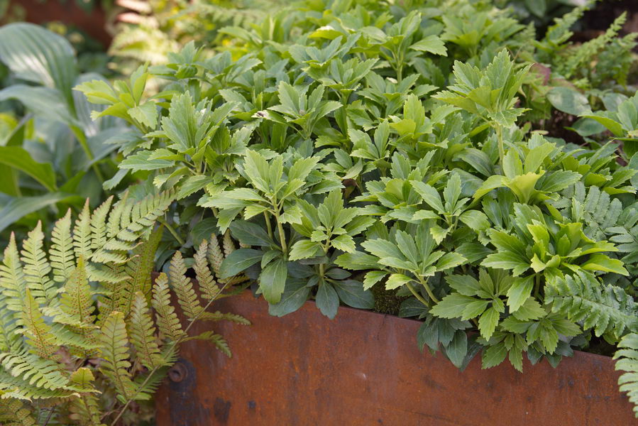 - Bodendecker, Chelsea Flower Show, Cortenstahl, Dryopteris erythrosora, Hochbeet, London, Pachysandra, Pachysandra terminalis, Schatten, Wuhan Water Garden