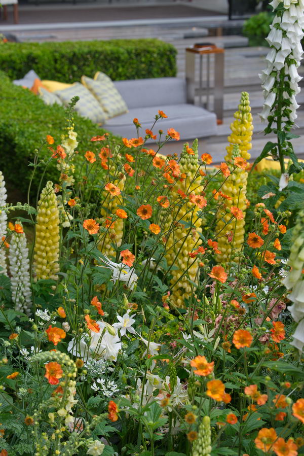 - Aquilegia vulgaris ‘Alba’, Astrantia major ‘Large White’, Camassia leichtlinii ‘Alba’, Delphinium ‘Sungleam’, Design Hay Joung Hwang, Digitalis, Geum ‘Banana Daiquiri’, Geum ‘Totally Tangerine’, Hesperis matronalis ‘White’, LG Eco-City Garden, Lilium perenne ‘Album’, Lupinus ‘Desert Sun’, Lupinus ‘Gallery White’, Melica altissima ‘Alba’, Orlaya grandiflora, Phlox divaricata ‘Fuller’s White’, Ranunculus acris ‘Citrinus’, Tellima grandiflora, Trollius europaeus, Trollius ‘Cheddar’, Trollius ‘Lemon Queen’, Verbascum ‘Gainsborough’