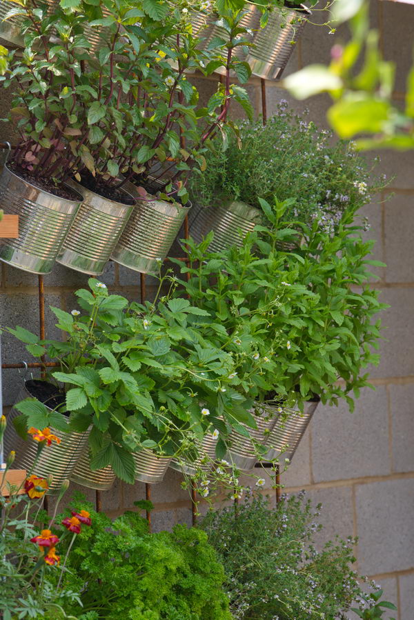 - Erdbeeren, Kräuter, urban gardening, vertikaler Garten, Minze, Petersilie, Oregano