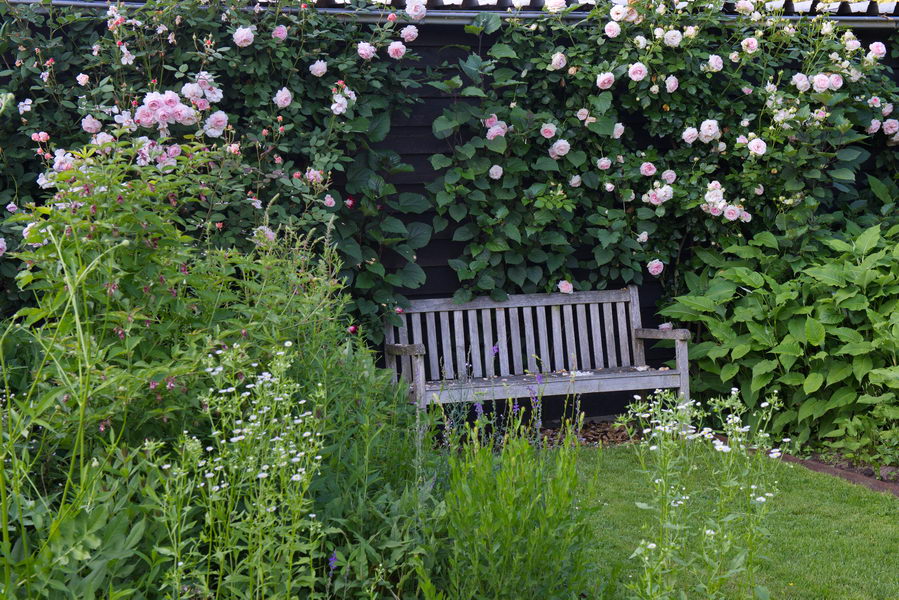 - Bank, Geerte's Tuin, gelb, Rose 'Eden Rose', Rose 'Shropshire Lass'