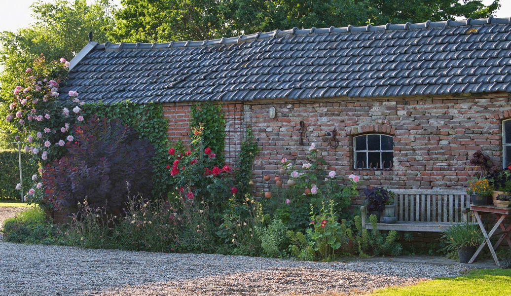- Bank, Geerte's Tuin, gelb, Rose 'Hot Chocolate'