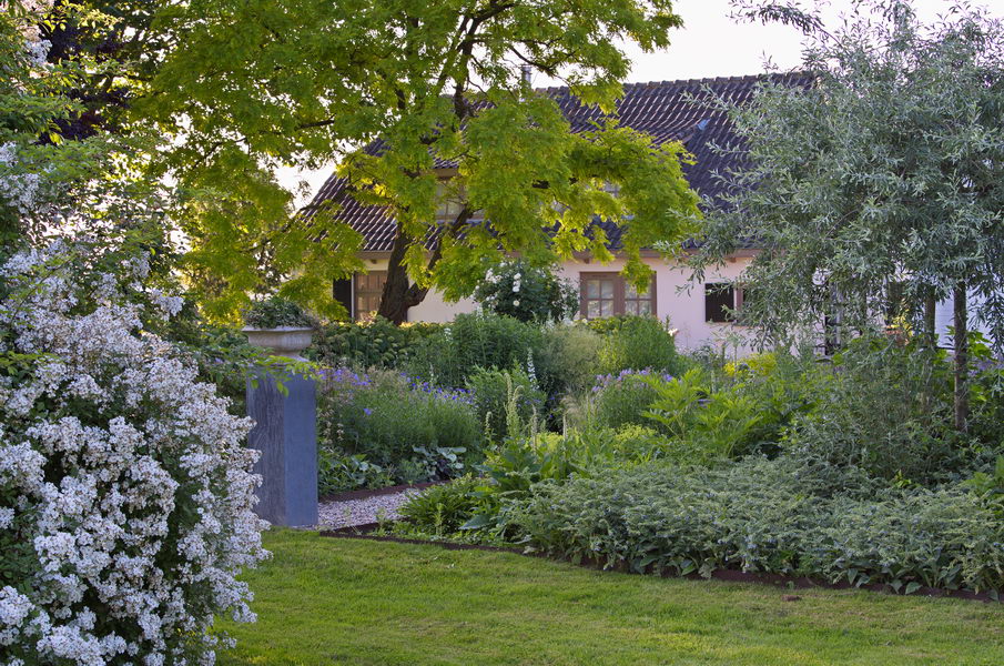 - Geerte's Tuin, gelb, Goldrobinie, Pyrus salicifolia, Robinia pseudoacacia 'Frisia', Scheinakazie, weidenblättrige Birne