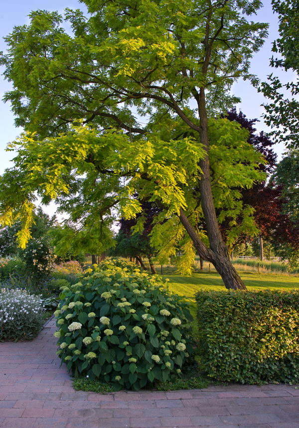- gelb, Goldrobinie, Hydrangea arborescens 'Strong Annabelle' oder 'Incrediball', Lychnis coronaria 'Alba, Robinia pseudoacacia 'Frisia', Scheinakazie, Geerte's Tuin