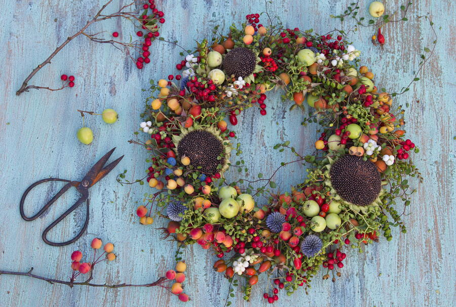 - DIY, Früchte, Hagebutte, Herbstkranz, Weißdorn, Zierapfel, Schneebeere