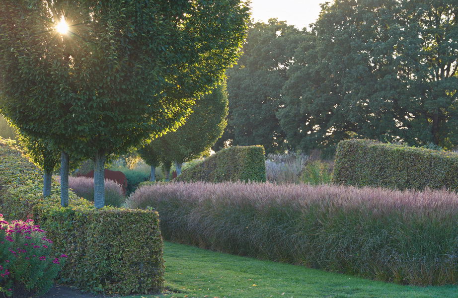- Carpinus betulus 'Fastigiata', Hecke, Miscanthus 'Kleine Silberspinne', Morlands Farm, Sussex Prairie Gardens