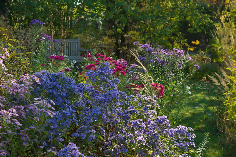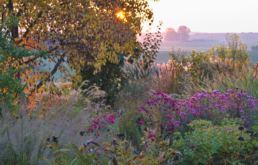 - Acer ginnala, Aster novae-angliae 'Alma Pötschke', Aster novae-angliae 'Rosa Sieger', Calamagrostis, Feuerahorn, Miscanthus, sibirischer Ahorn, Gräser