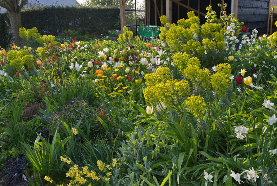 - Doronicum, Euphorbia characias ssp. wulfenii, Garten Maldegem