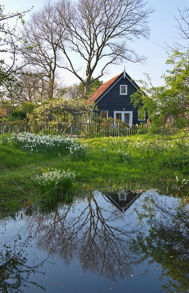 - Garten Maldegem, Narcissus jonquilla 'Pueblo', Narzissen, Obstbaum, Obstblüte, Teich