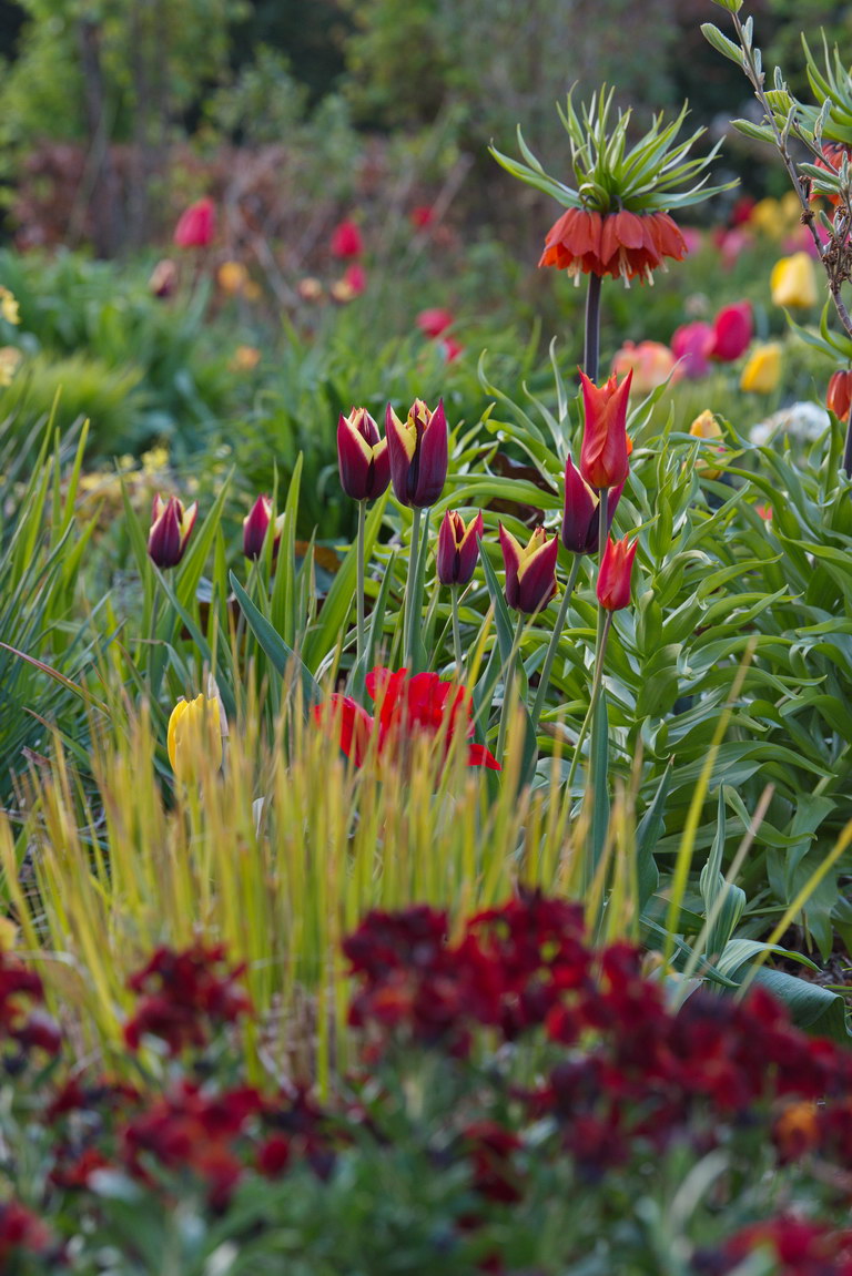 - Erysimum cheiri, Fritillaria imperialis, Tulpe 'Ballerina', Tulpe 'Gavota', Tulpen