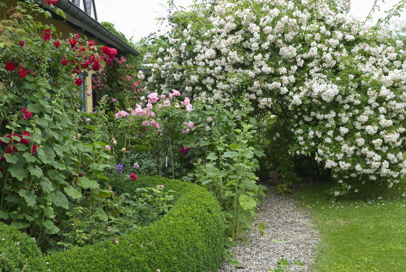 - Garten Sybille Ehmann-Green, gelb, Haus, Rosenbogen