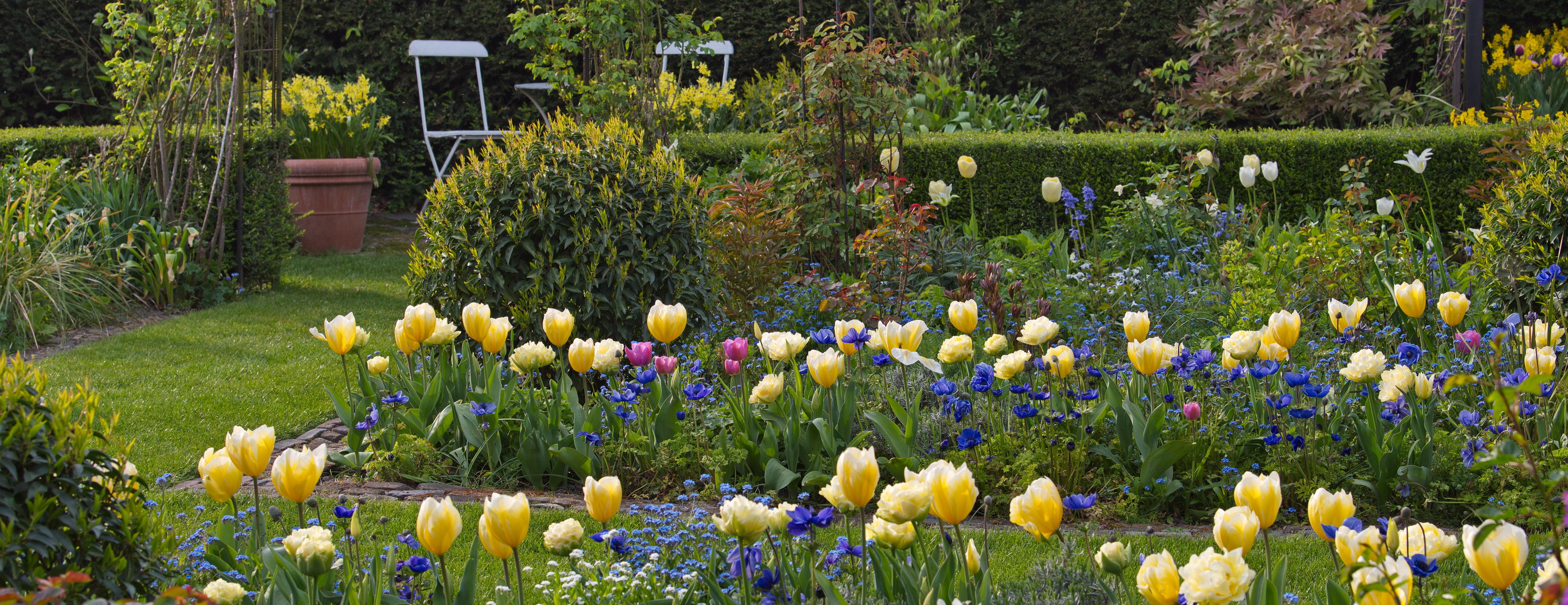 - Anemone coronaria 'Mr. Fokker', Myosotis, Tulpe 'Sweetheart', Tulpe 'Verona', blau, gelb, Panorama