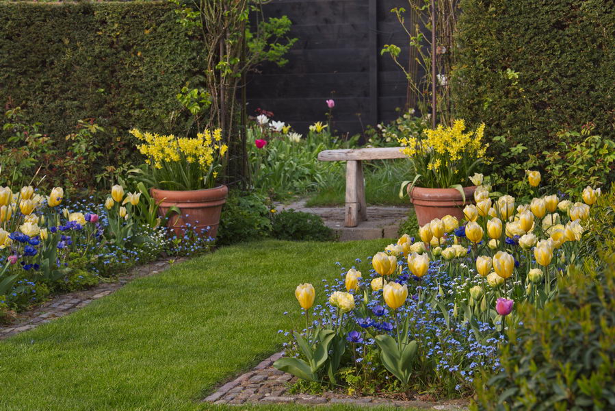 - Anemone coronaria 'Mr. Fokker', Myosotis, gelb, Garten van Baalen