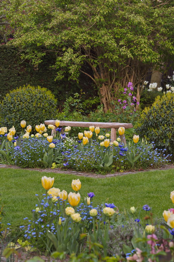 - Anemone coronaria 'Mr. Fokker', Bank, Myosotis, gelb, Garten van Baalen