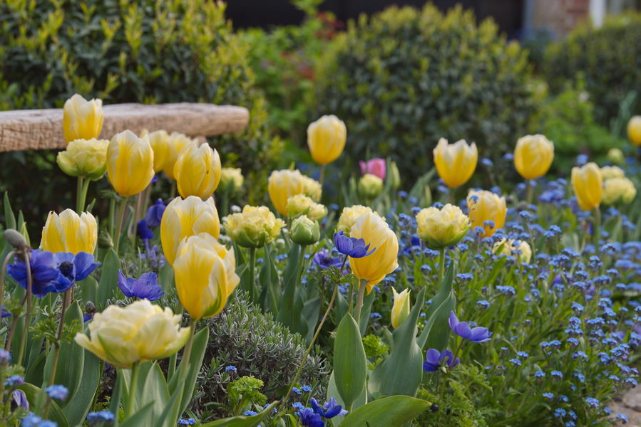 - Anemone coronaria 'Mr. Fokker', Myosotis, gelb, Garten van Baalen