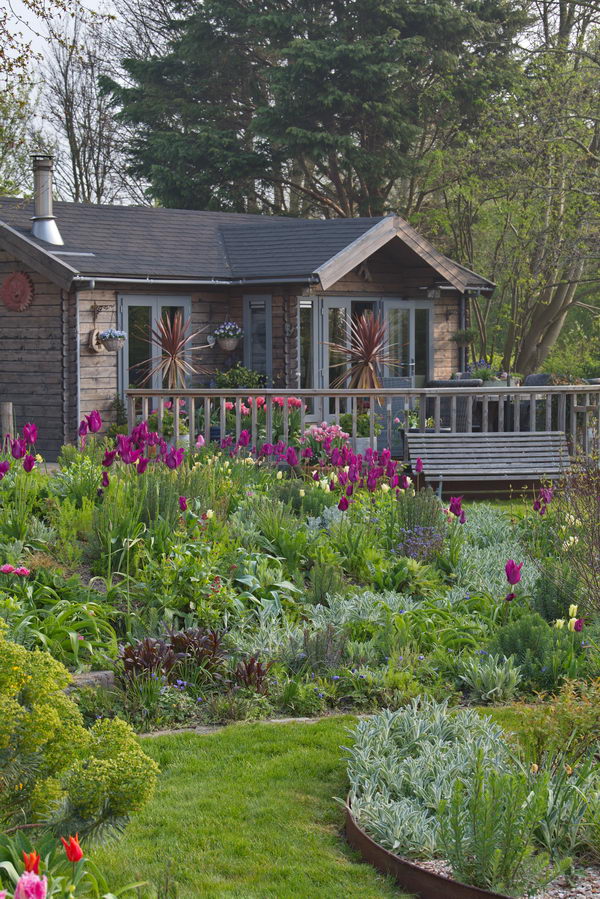 - Euphorbia characias ‘Black Pearl’, Garten Verschuur, Gartenhaus, Tulpe 'Purple Dream', Garten Les Deesses Vertes
