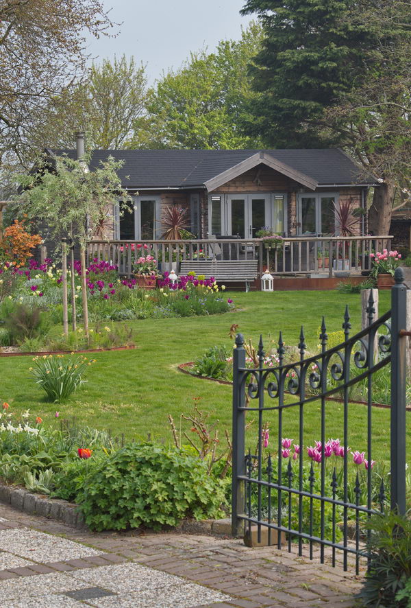 - Garten Verschuur, Gartenhaus, Pyrus salicifolia, Tulpe 'Purple Dream', Zaun, weidenblättrige Birne, Garten Les Deesses Vertes