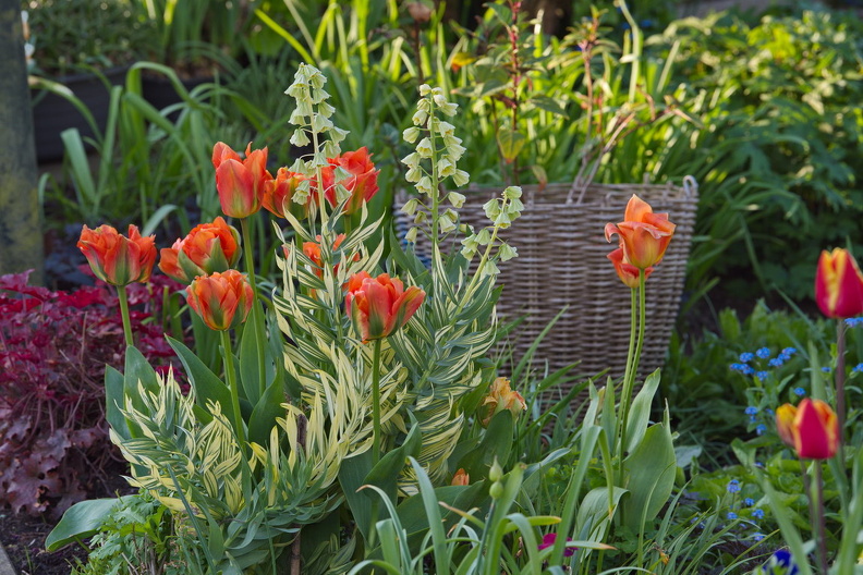 - Petasites officinalis, Steg, Stuhl, Tulpe 'Dynasty', Tulpe 'Orange Emperor'