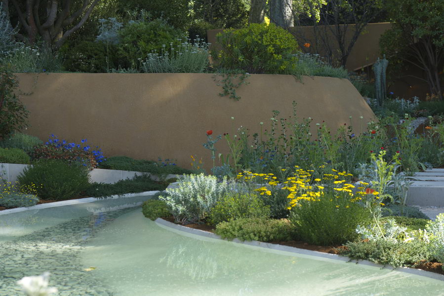 - Adonis annua, Artemisia 'Powis Castle', Asphodelus albus, Linum narbonense 'Heavenly Blue', Mauer, Wasserlauf, Chelsea Flower Show