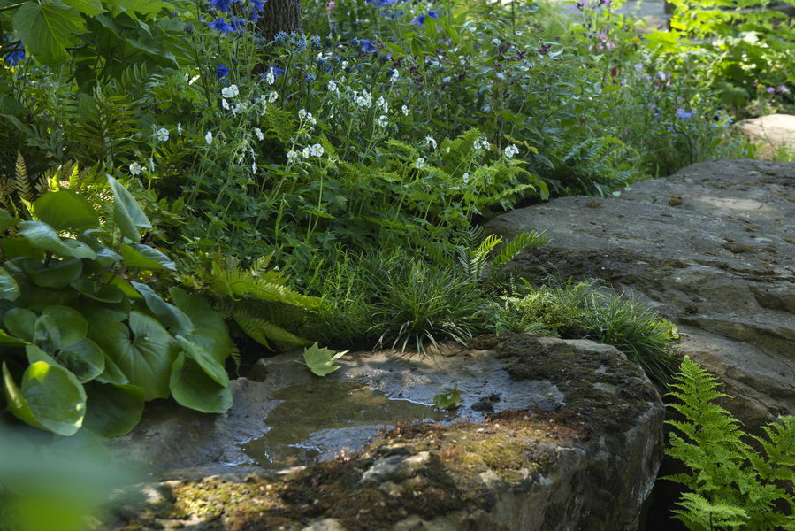 - Aquilega, Blechnum spicant, Dryopteris affinis, Dryopteris erythrosora, Geranium phaeum 'Album', Schatten, Chelsea Flower Show
