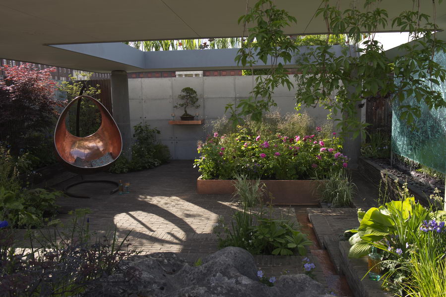 - Chelsea Flower Show, Hängesessel, kleiner Garten, modern, Rose 'Gertrude Jekyll', Rose 'Munstead Wood', Sambucus nigra 'Black Lace', urban, Wasserrinne