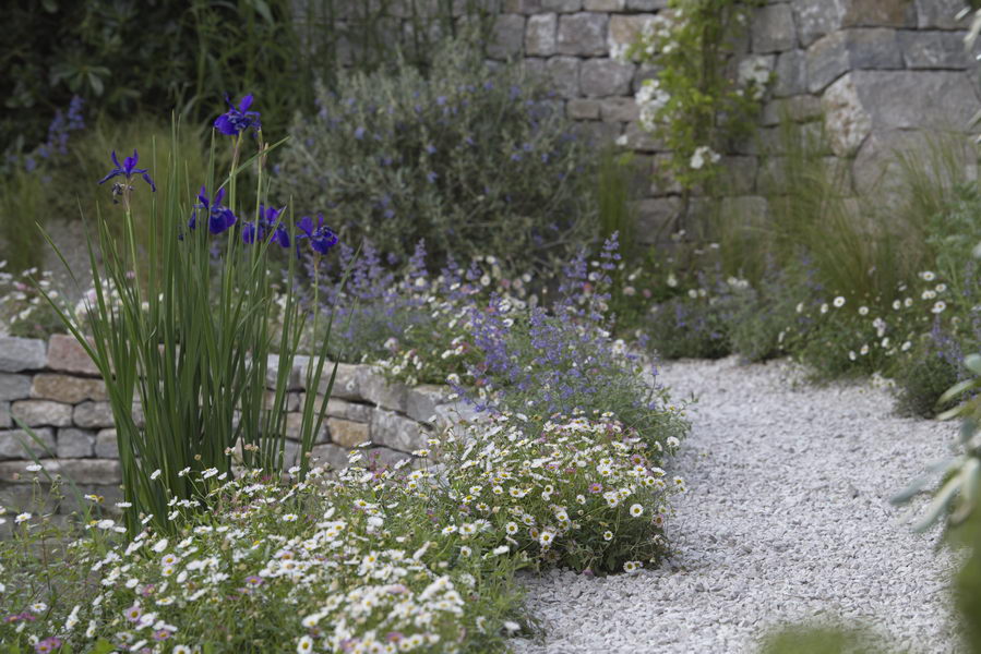 - Erigeron karvinskianus, Iris laevigata, Kies, Nepeta racemosa, Weg, Chelsea Flower Show