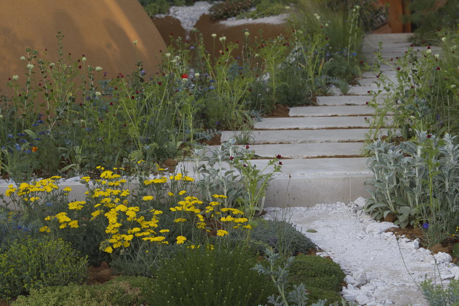 - Adonis annua, Asphodelus albus, Chelsea Flower Show, Cotula hispida, Isatis tinctoria, Kiesgarten, Linum narbonense 'Heavenly Blue', Mauer, Nigella hispanica, Weg