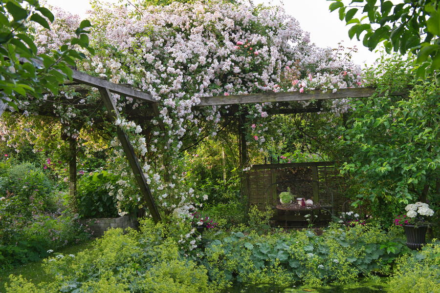 - Pergola, Rose 'Paul's Himalayan Musk', Alchemilla mollis