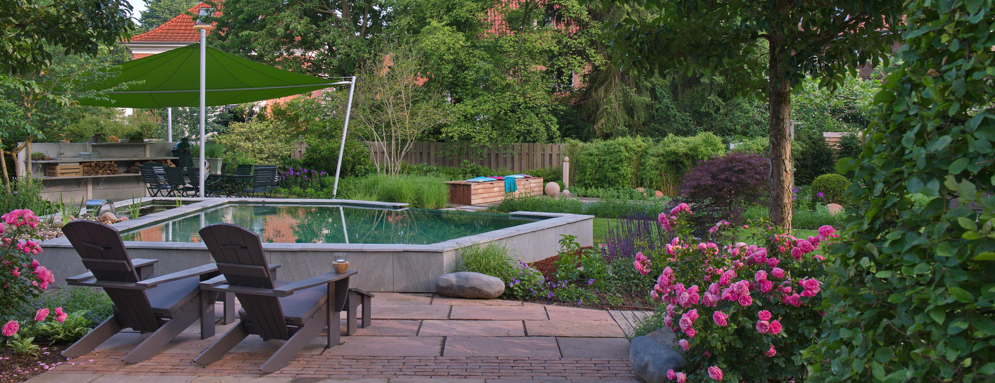 - Adirondack Chair, Crataegus x lavallei 'Carrierei', Gartenküche, Pool, Rose 'Leonardo da Vinci', Sitzplatz, Panorama