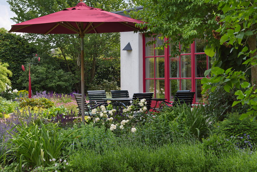 - Sitzplatz, Sonnenschirm, Strauchrose 'Artemis®', Terrasse