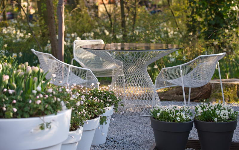 - Blumentopf, Drahtstühle, Keukenhof, weiß