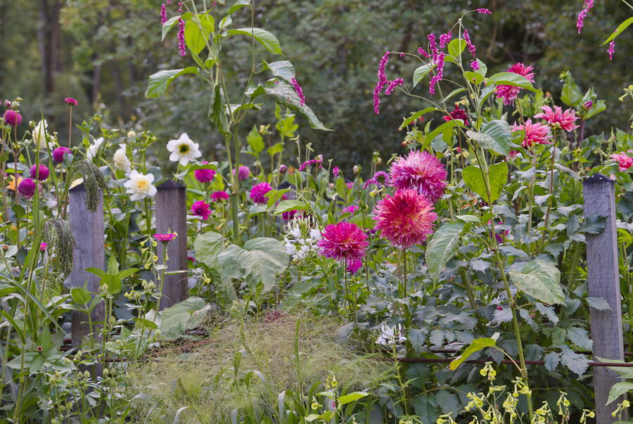 - Dahlien, Kiss-Me-Over-the-Garden-Gate, Polygonum orientale, Dahlia 'Myrtle's Folly'