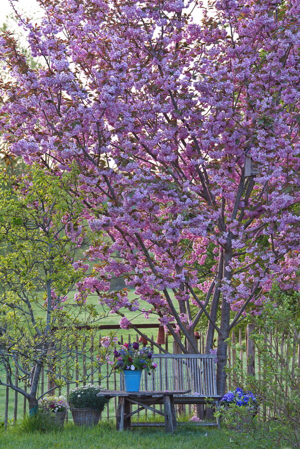 - Bank, Prunus serrula 'Kanzan', Sitzplatz, Strauß, Tulpen, Zierkirsche