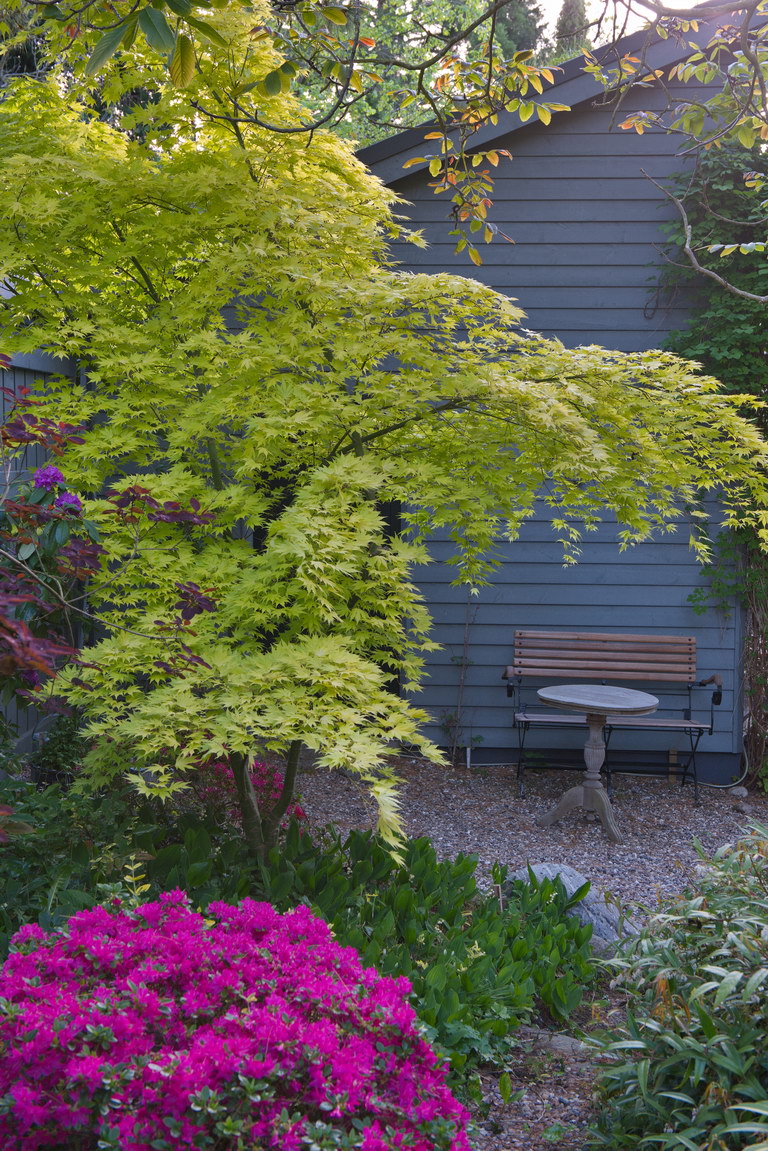 - Acer palmatum 'Orange Dream', Rhododendron obtusum 'Kermesina', Sitzplatz, Gartenhaus