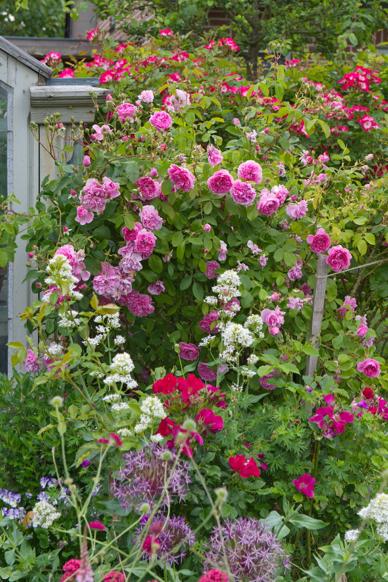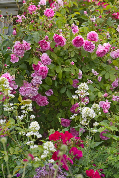 - pink, rosa, Rose ' Manhatten Blue', Rose 'Harlow Carr', Strauchrose 'Bukavu'