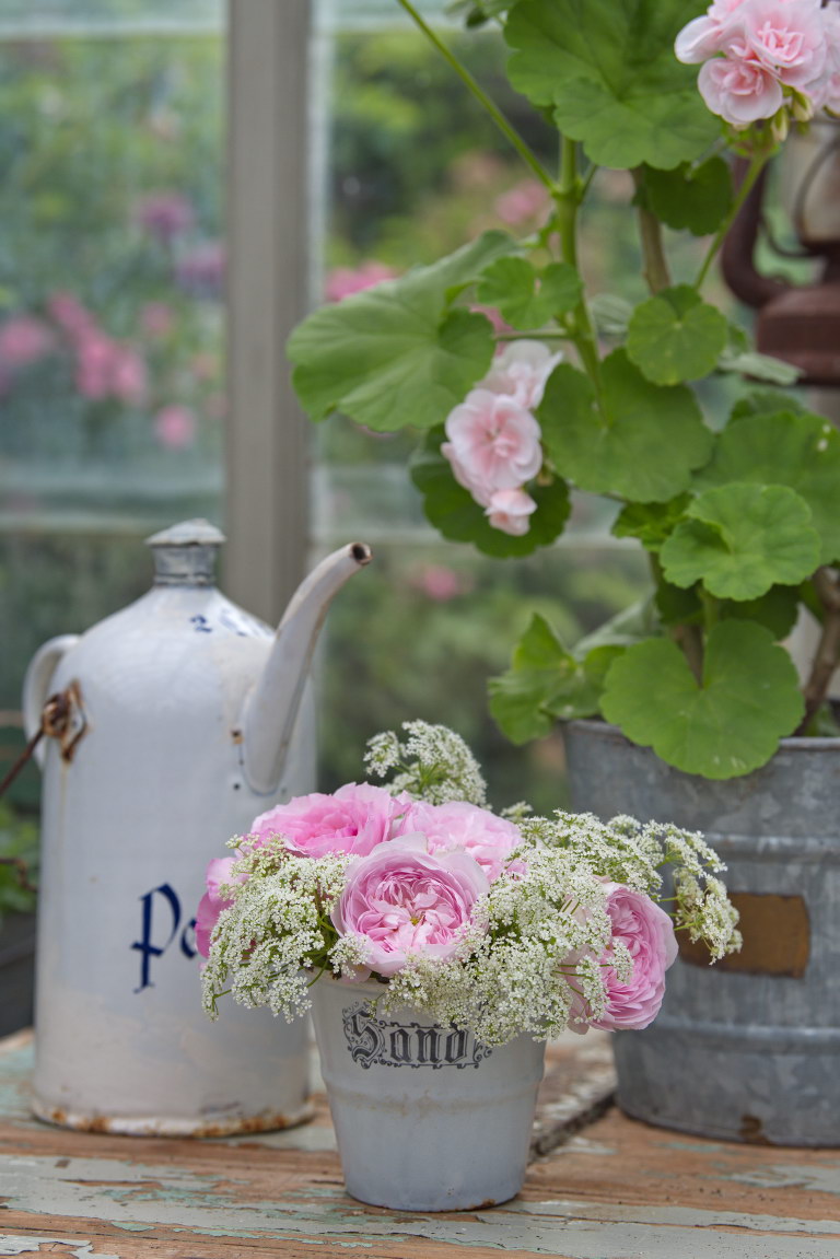 Antik, Emaille, Geranien, Rose 'Duchesse de Montebello', Strauß, rosa