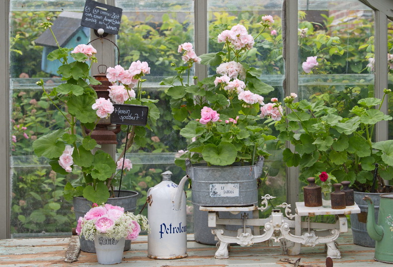 - antik, Geranien, rosa, Rose 'Duchesse de Montebello', Strauß