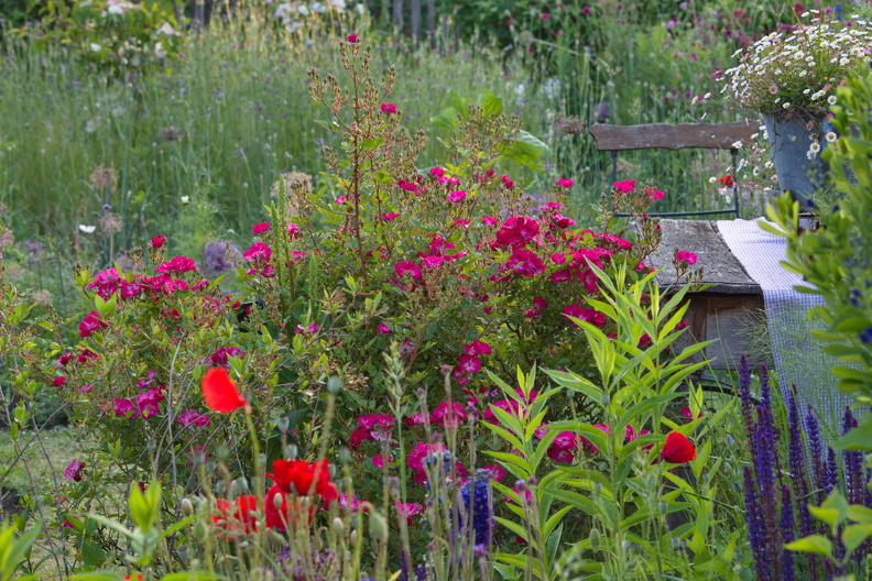 Kletterrose, Rose 'Chevy Chase', Polygonum polymorphum 'Johanniswolke'