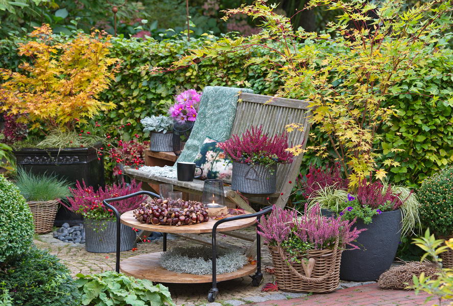 - Acer palmatum 'Beni kawa', Acer palmatum 'Sangokaku', Bank, Calluna, Carex oshimensis 'Evergold', Herbst, Kissen, Sitzplatz, Terrasse, Hecke, Fagus sylvatica