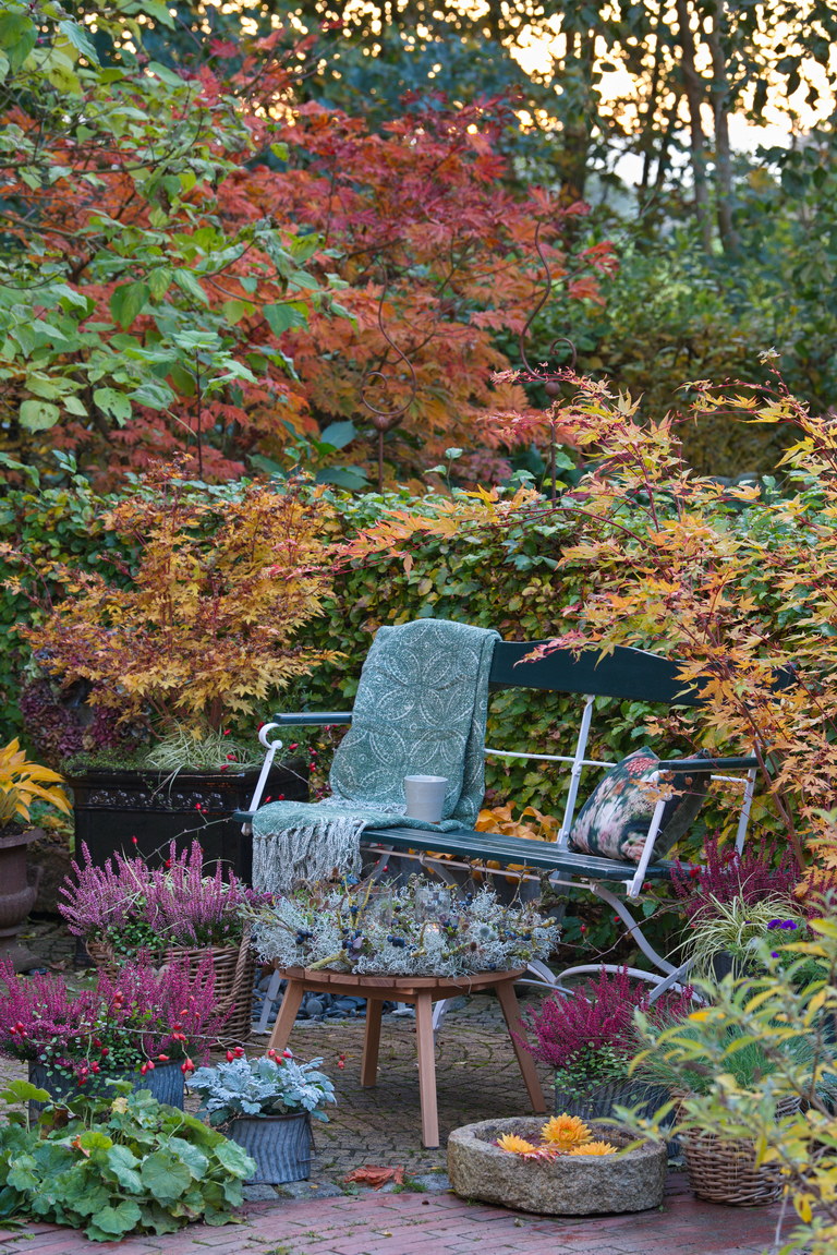 - Acer japonicum 'Aconitifolium', Acer palmatum 'Beni kawa', Acer palmatum 'Sangokaku', Bank, Buchs, Calluna, Carex oshimensis 'Evergold', Fagus sylvatica, Hecke, Herbst, Kissen, Sitzplatz, Terrasse